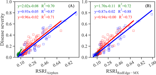 圖12.展示了三個生長階段(A)Airphen和(B)RedEdge-MX模擬數(shù)據(jù)的DS-RSRI關(guān)系。綠色、藍色和紅色正方形分別代表抽穗、開花和灌漿階段的樣本。RSRI是通過參考Airphen或RedEdge-MX的帶寬和中心波長,從高光譜數(shù)據(jù)立方體模擬的多光譜反射率計算得出的。將454nm、675nm和740nm的波段分別替換為每個傳感器的藍色、紅色和近紅外波段。所有回歸均具有統(tǒng)計學意義(p值<0.001)