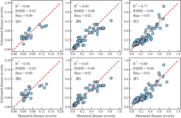 圖13.使用基于RSRI的模型從多光譜數(shù)據(jù)(A-C Airphen相機,D-F RedEdge-MX相機)得出的測量和估算的量化DS散點圖,分別對應(yīng)抽穗(A, D)、開花(B, E)和灌漿(C, F)階段。