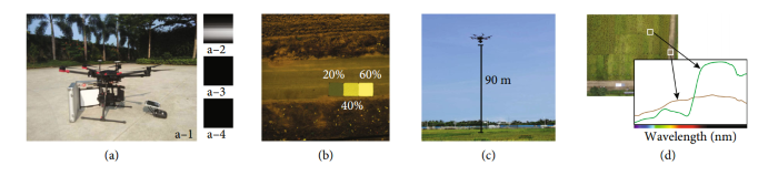 圖1:高光譜相機(jī)校準(zhǔn)與圖像采集。(a) 在陽(yáng)光下使用標(biāo)準(zhǔn)白板校準(zhǔn)曝光時(shí)間(a-1),包括拍攝白板圖像(a-2)、暗背景圖像(a-3)以及增加曝光時(shí)間后的暗背景圖像(a-4)。(b) 反射率分別為20%、40%和60%的參考反射面板。(c) 圖像采集時(shí)無(wú)人機(jī)飛行高度為90米。(d) 示例樣本區(qū)域及其對(duì)應(yīng)的水稻和土壤光譜曲線