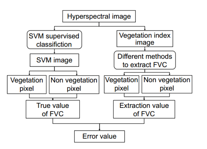 然后,分別采用像元二分法和DPK-means算法提取小麥的FVC,并基于支持向量機(jī)(SVM)監(jiān)督分類結(jié)果對(duì)比分析了兩種方法的提取效果,具體的提取過程如圖3所示。最終,通過誤差分析(EF、RMSE)、擬合度(R²)和誤差分布圖 對(duì)比不同方法的表現(xiàn),以驗(yàn)證 DPK-means 在植被覆蓋度提取中的適用性和優(yōu)勢(shì)。