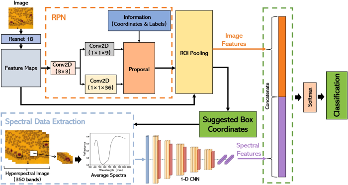 本研究旨在提升白細(xì)胞檢測(cè)的自動(dòng)化水平和識(shí)別準(zhǔn)確性,提出了一種結(jié)合高光譜顯微成像系統(tǒng)(HMI)與多數(shù)據(jù)融合的Faster RCNN深度學(xué)習(xí)模型。本文充分利用高光譜成像可同時(shí)獲取圖像與光譜信息的優(yōu)勢(shì),構(gòu)建了一個(gè)聯(lián)合分析模型。作者分別設(shè)計(jì)了基于光譜數(shù)據(jù)的一維卷積神經(jīng)網(wǎng)絡(luò)(1-D CNN)與基于偽彩色圖像的Faster RCNN模型,用于單一模態(tài)下的分類性能分析。進(jìn)一步地,提出融合兩種模態(tài)的Multi-data Faster RCNN模型,在Faster RCNN中引入1-D CNN光譜特征提取模塊,并通過特征拼接實(shí)現(xiàn)圖像與光譜信息的聯(lián)合識(shí)別。