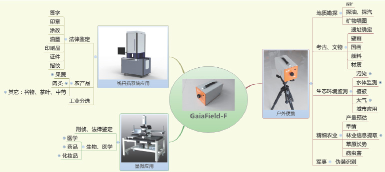 GaiaField 系統(tǒng)有著輕便靈活,續(xù)航能力出色、智能化、數(shù)據(jù)分析處理功能齊全、能夠?qū)崟r監(jiān)控等特點。廣泛適用于戶外和實驗室內(nèi)的應(yīng)用需求,例如:目標探測與識別、偽裝與反偽裝等軍事領(lǐng)域,地面物體與水體遙測、現(xiàn)代精細農(nóng)業(yè)等生態(tài)環(huán)境監(jiān)測領(lǐng)域,刑偵、文物保護、生物醫(yī)學、塑料垃圾、煙草煙葉的工業(yè)分選,化學氣體燃燒火焰、地質(zhì)礦石分析,油氣巖層熒光分析等等領(lǐng)域。