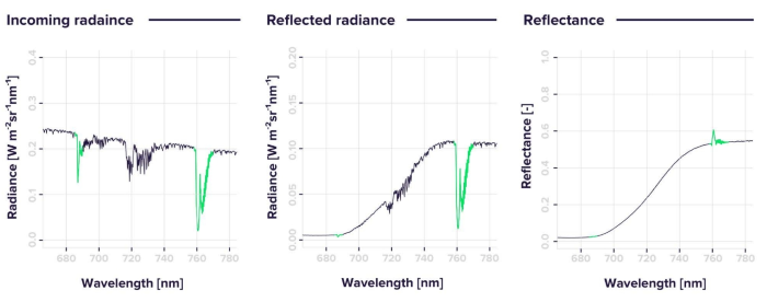 葉綠素熒光在植被光合生理探測方面具有獨特的技術優(yōu)勢,是“實際光合作用”的直接探測方法??梢哉f植被葉綠素熒光遙感是近10年來植被遙感領域最具突破性的研究前沿。隨著研究和技術的發(fā)展,SIF遙感最近10幾年來得到了長足的進步。SIF是光下測量葉綠素熒光的典型代表,通過測量上行輻亮度對下行太陽光譜Fraunhofer暗線的填充來反演植被發(fā)出的葉綠素熒光強度,通常會得到如下的光譜曲線。